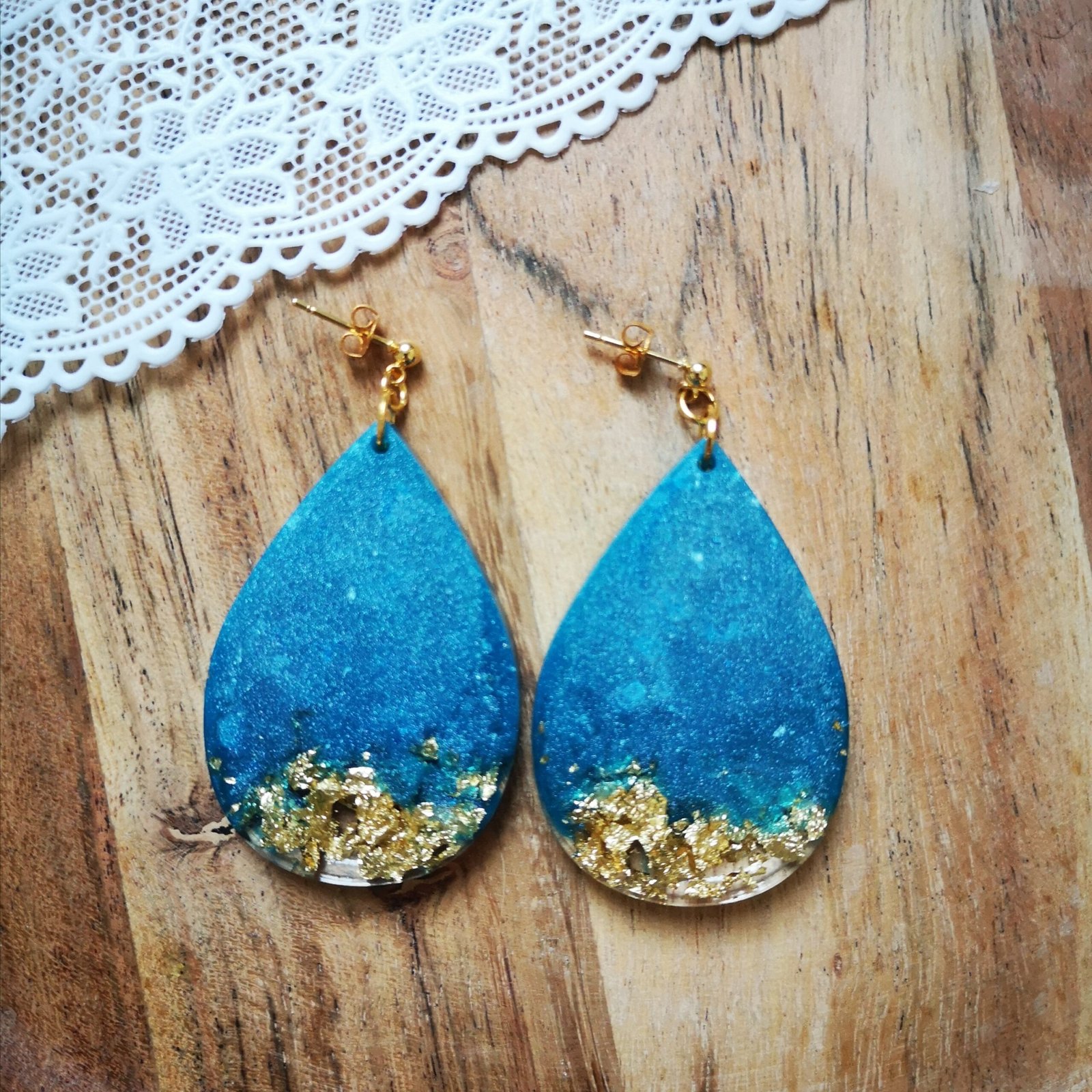 Boucles d’oreilles Célestia : l’élégance du ciel nocturne en bijoux. Bleu galaxie, feuilles d’or, reflets cosmiques. Délicates, légères et artisanales. Cadeau poétique ✨