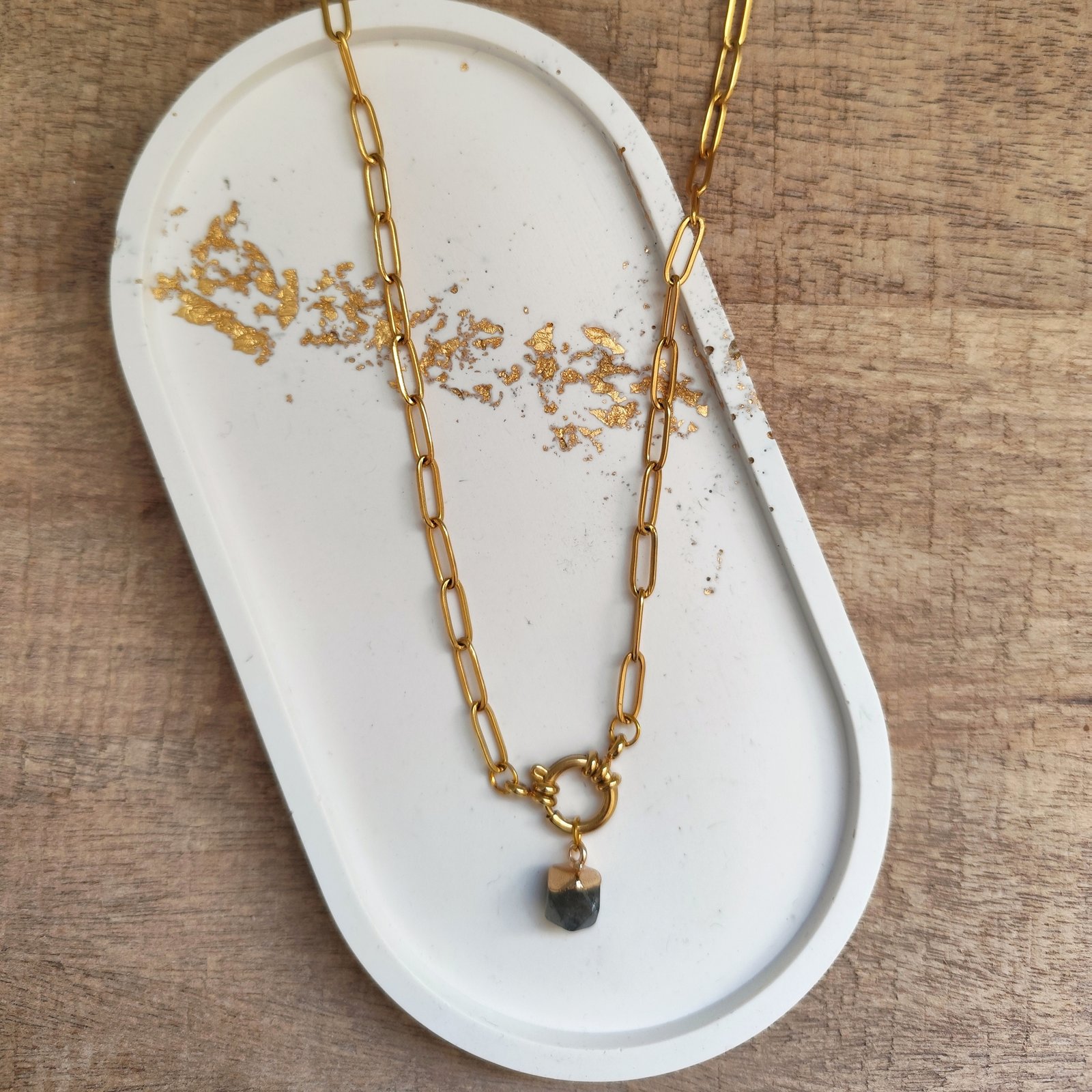Le collier est rehaussé d’un fermoir bouée à l’avant, pensé à la fois comme élément pratique et décoratif. Sur ce fermoir vient se suspendre un pendentif en labradorite, pierre à la beauté envoûtante aux nuances grises, bleutées et dorées selon la lumière.