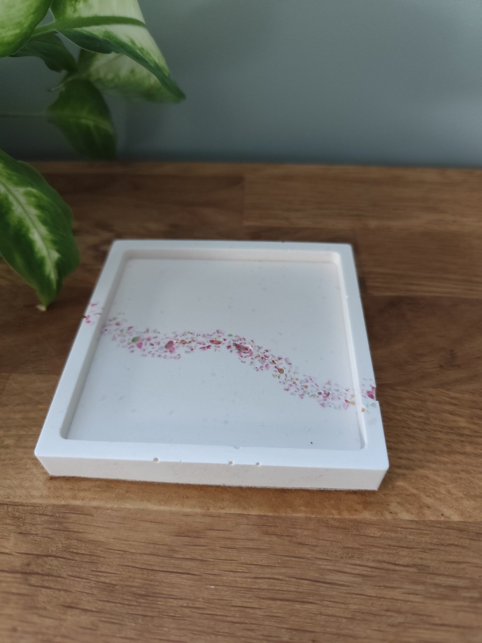 Chaque plateau Rosélia est réalisé avec soin dans notre atelier, en jesmonite et éclats de verre rose soigneusement intégrés. La jesmonite, matériau éco-responsable et durable, est choisi pour sa légèreté, sa solidité et son aspect doux au toucher.